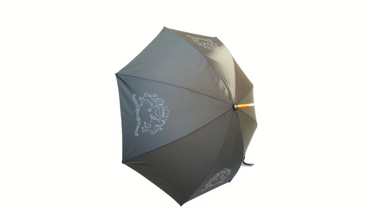 Wind- und regenfester Regenschirm mit Polyester-Pongee Bezug Anthrazit. Automatik Holzstockschirm mit Metall-Spitzen. Eleganter Rundhakengriff aus Holz.