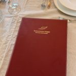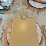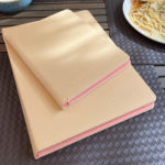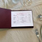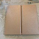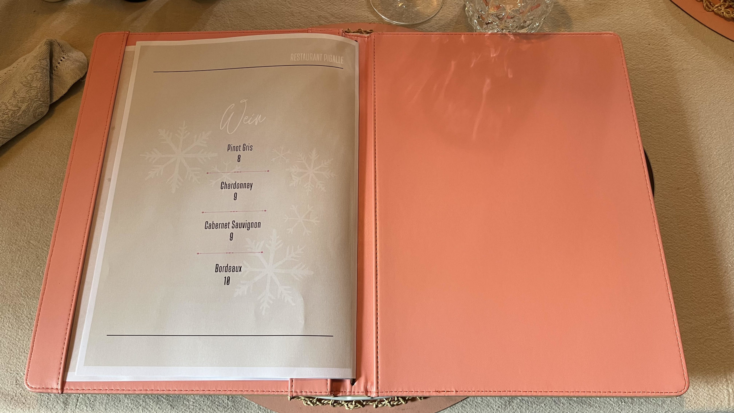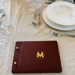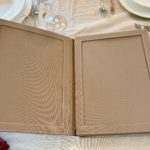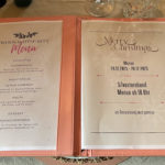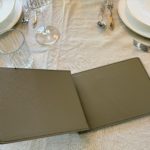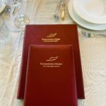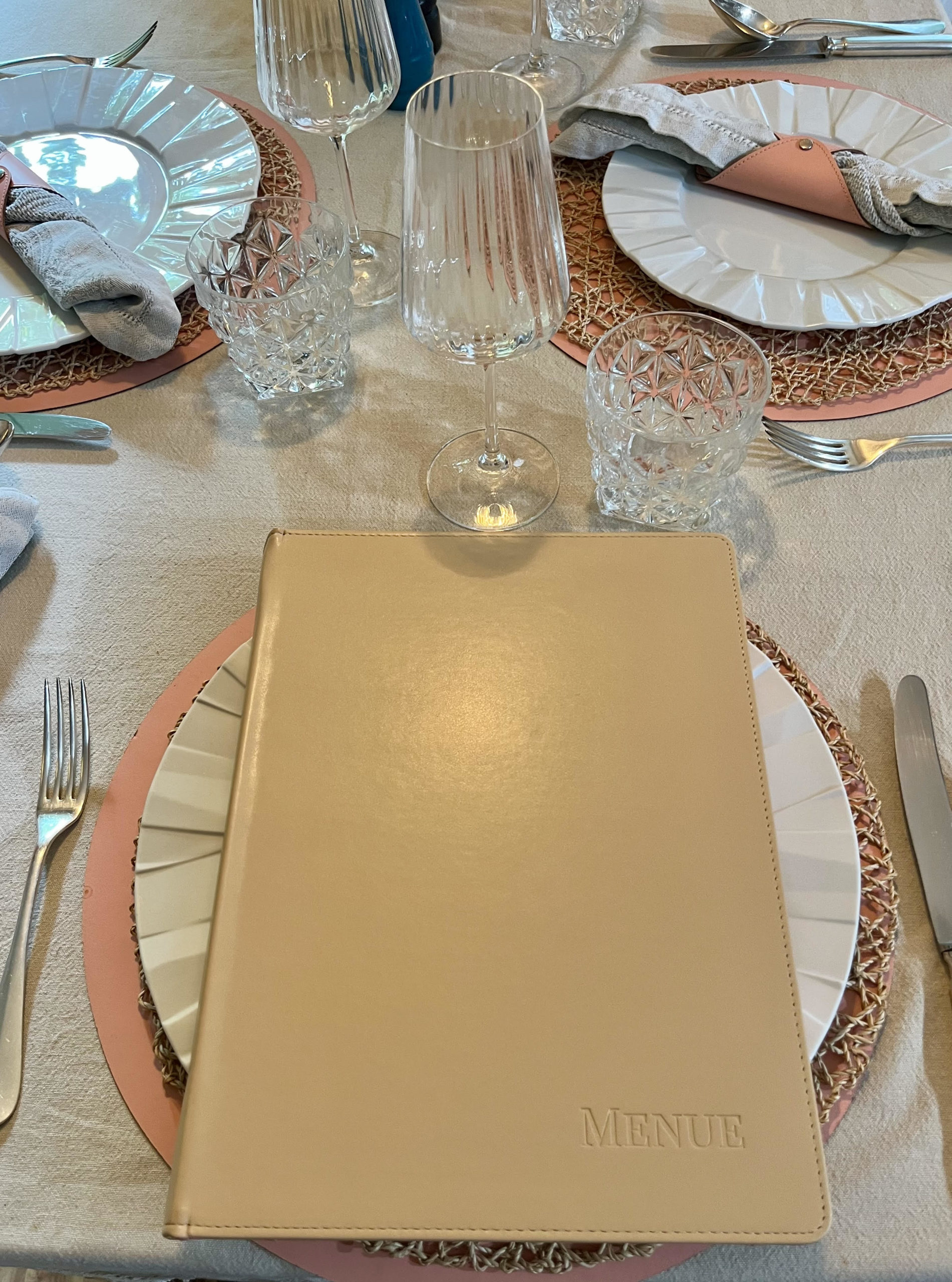 Menükarte A4 Format, mit Elsastikband im Buchrücken, mit Emfpfehlungsrahmen auf der ersten Seite,